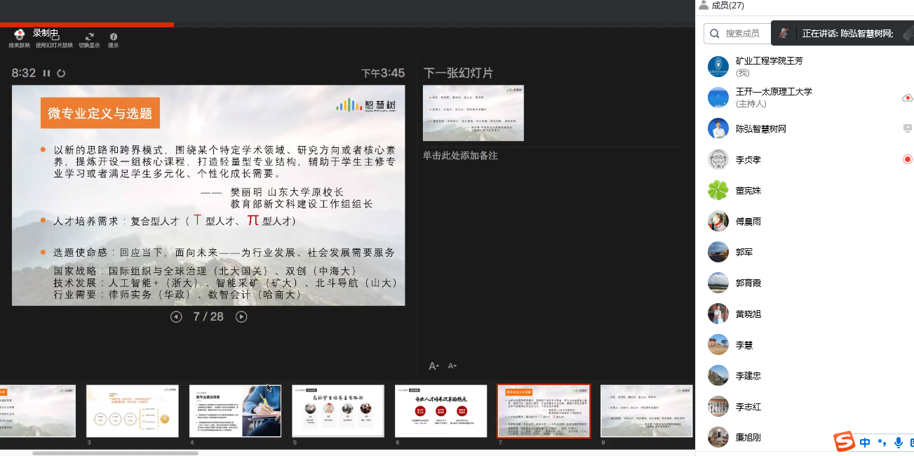 特邀嘉宾智慧树网副总裁、教师服务中心总监陈弘作题为《微专业创新的平台服务与实践》主题报告,报告围绕微专业建设的背景、意义和思路、课程体系设计、微专业校内外运行实践与平台建设等方面展开。与会人员与专家进行了热烈交流。