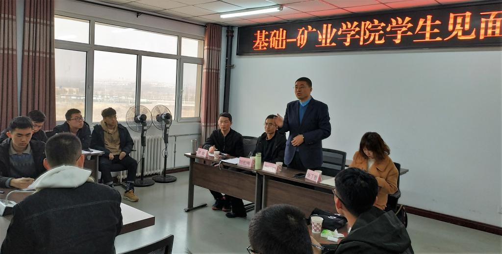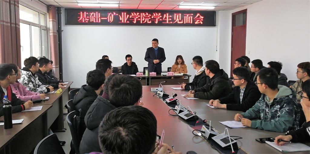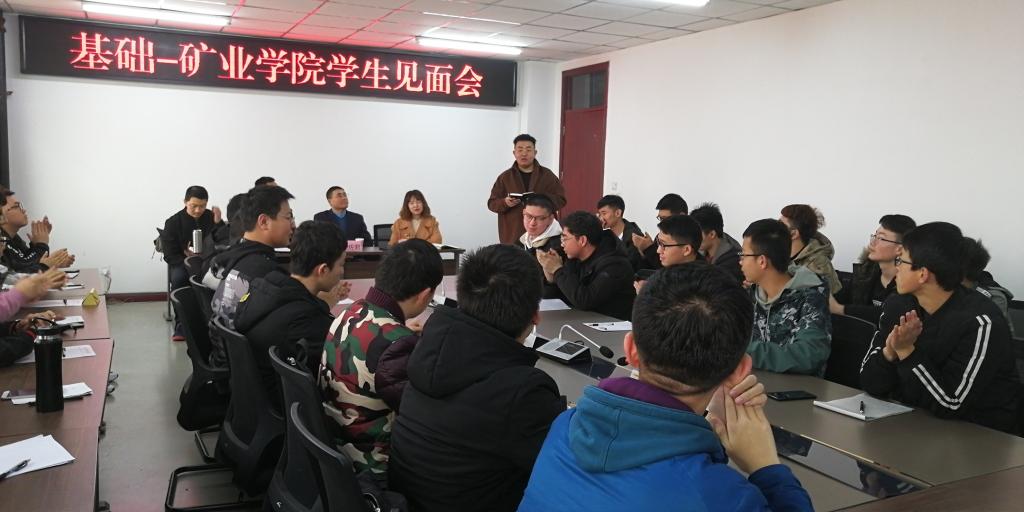 2019年2月27日,我院学生系统负责人在基础学院协调安排下与2018级矿业学科各班学生干部进行了座谈。党委副书记武佐君、学工办主任刘宏伟、团委书记张丁香、2017级年级主任洪俊、2017级班长代表王荣作为学院学生系统代表出席会议。会议由学工办主任刘宏伟主持。