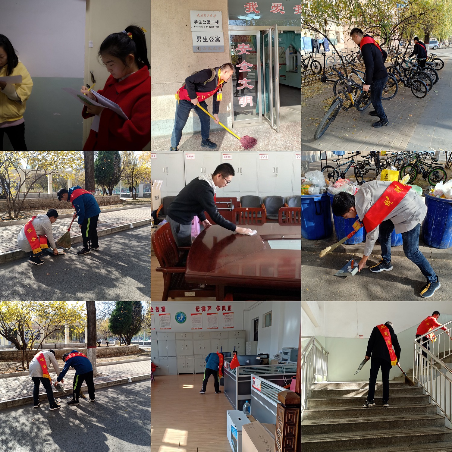 学院团学教师、预备党员与志愿者组成了宿舍评比小组根据宿舍卫生检查标准对矿院学生宿舍进行检查评分。志愿者们在虎峪校区带着清扫工具打扫校园,并对致明楼大厅及、楼道、办公室及会议室进行了整理清洁。