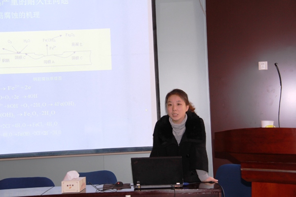 郭育霞博士的报告题目为《钢筋混凝土柱电化学除氯后的抗震性能》。电化学除氯后,钢筋与混凝土之间的粘结损失可高达60%以上,这对于承受反复荷载的结构或构件是非常不利的。本文通过低周反复荷载试验,对混凝土柱电化学除氯处理后的抗震性能进行了研究,分析了构件的破坏特征、滞回曲线和耗能、骨架曲线和刚度退化。研究表明,钢筋混凝土试件经电化学处理后,在反复荷载作用下,其破坏形式可能由弯曲破坏转化为弯曲-粘结破坏,滞回曲线由丰满变得干瘪,耗能能力降低,峰值后试件的承载力下降,刚度降低。因此,需要研究在利用电化学除氯的优势延长钢筋混凝土结构使用寿命的同时,最大限度地降低电化学除氯带来的不利作用。此外,根据钢筋混凝土柱电化学除氯后的偏心受压试验结果,提出了钢筋混凝土构件的骨架曲线的确定方法。研究表明,对于经过电化学除氯处理的钢筋混凝土柱,尽管由于除氯作用引起的钢筋与混凝土的滑移不能再使构件的变形保持平截面,但通过引入粘结粘退化影响系数,对根据平截面假定计算的荷载-变形曲线进行修正,可获得与试验符合的结果。