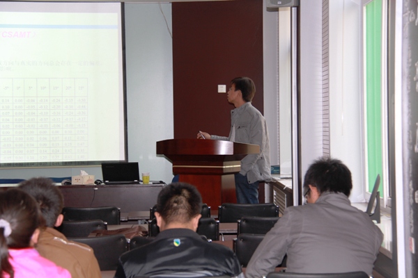 余传涛博士的报告题目《含激电效应的CSAMT二维正演与联合反演应用研究》。报告首先阐述了地球物理方法在地球科学中的重要地位以及现代社会发展中的重要作用,重点介绍了可控源音频大地电磁法的理论及方法,提出了目前该方法存在的主要问题:激发极化效应对CSAMT探测结果的影响。在利用Cole-Cole模型研究激发极化效应对CSAMT响应影响的基础上,进行了了存在IP(induced polarization, 简称IP)效应的CSAMT法一维、二维正演研究,然后进行了CSAMT与激电测深数据的联合反演研究,利用IP测深得出的极化率以及电阻率参数,应用于CSAMT的反演中,在一定程度上消除了IP效应对CSAMT法测量的影响,有利于提高CSAMT法的探测精度。