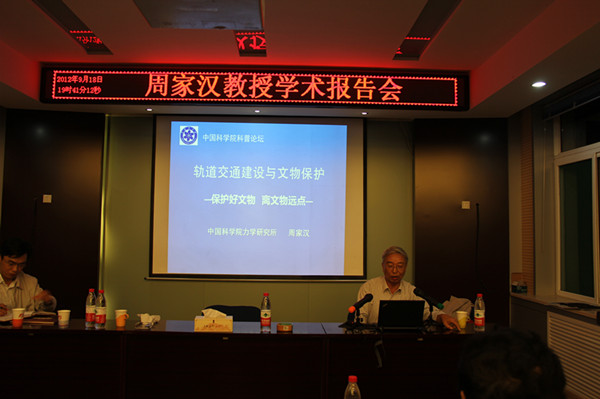 报告中,周教授介绍了他的研究成果:应用典型地铁工程有北京地铁6号线避绕紫禁城改移平安大道走向;提出“西安地铁穿城而过不利于古城建筑文物的保护”的意见上书国务院,并得到温总理的批示;修建合武铁路为保护邻近汉王陵地下文物,六安段南移距离确定;考虑列车运营振动对龙门石窟文物的影响,焦枝铁路复线外移距离确定;提出“采用既有线列车运行振动传播的规律和比例距离推测未来高速铁路列车运行振动的方法”,成功用于京沪高速铁路苏州站选址和保护虎丘塔安全距离的确定等。畅叙了关于地铁震动安全以及文物保护方向的相关问题。