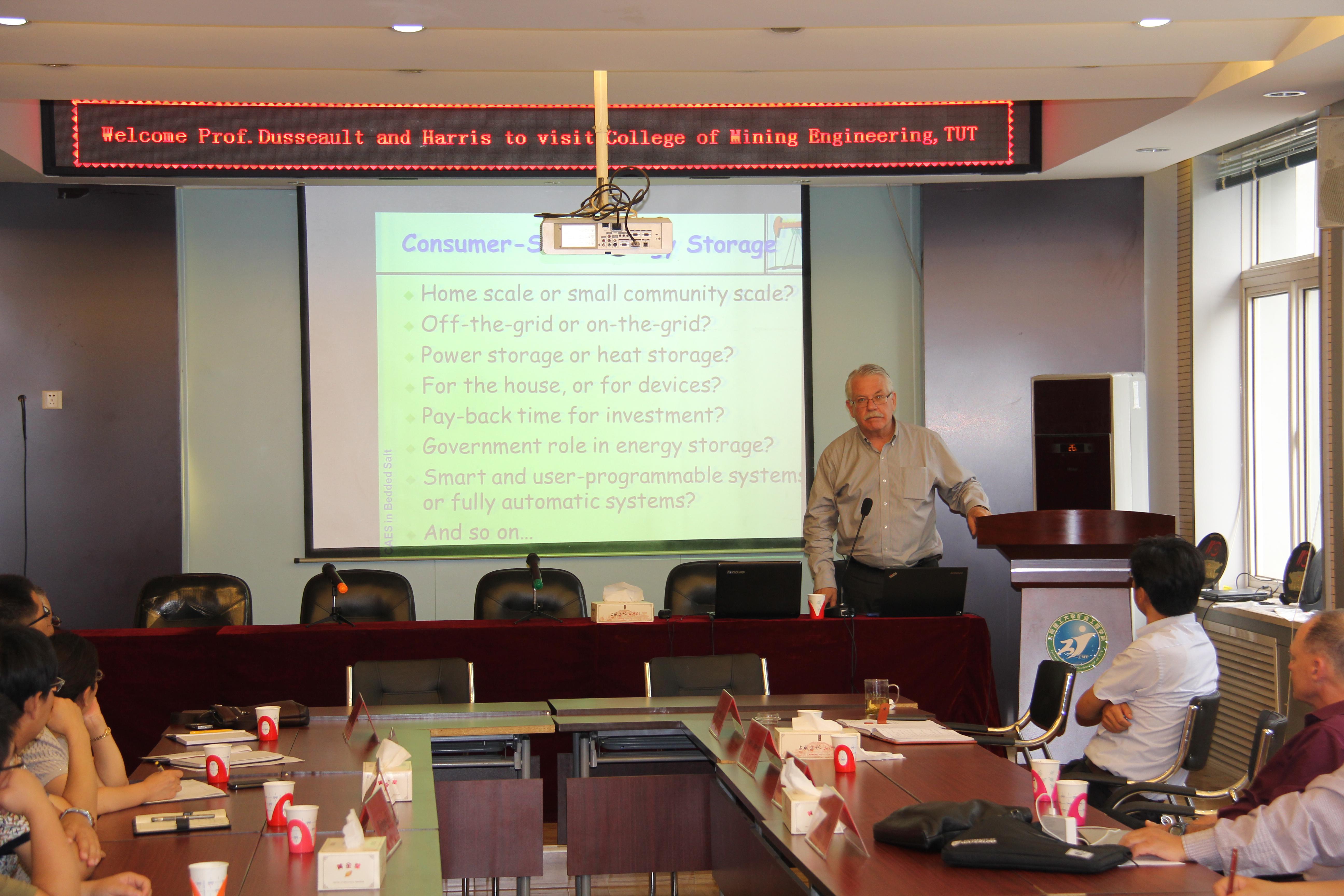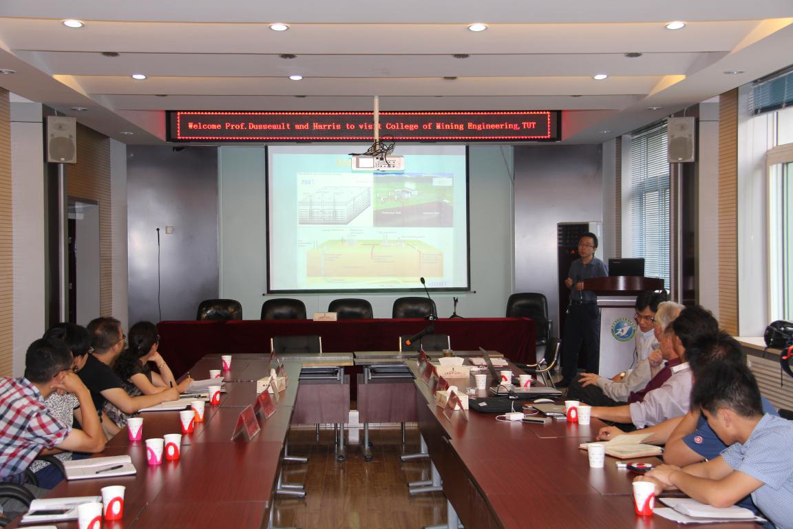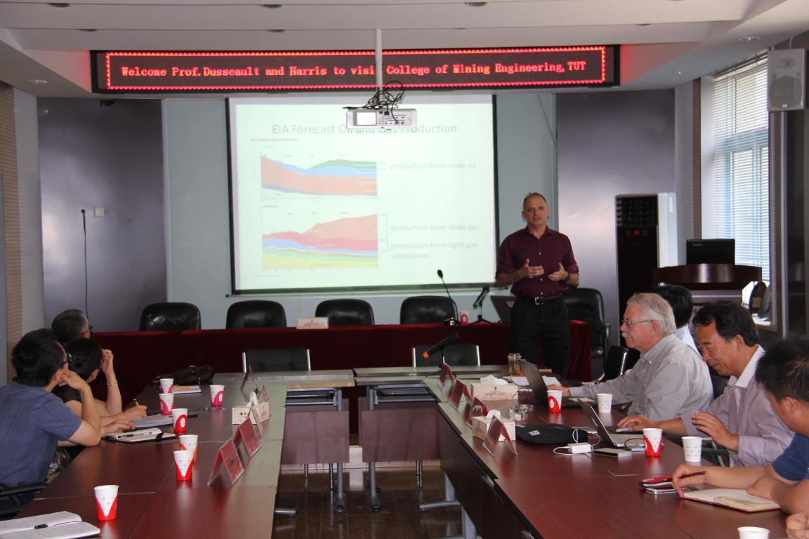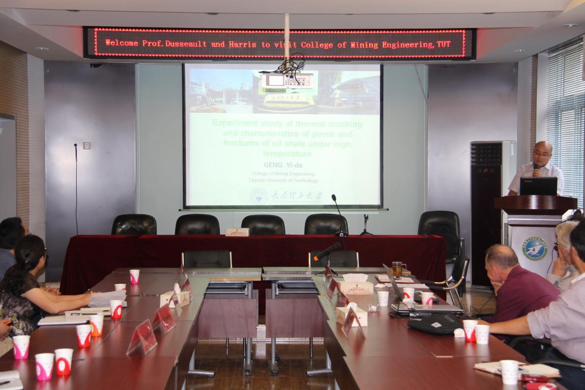 会议开始,梁卫国院长对远道而来的三位教授表示了热情的欢迎。接下来,徐宝慈教授对滑铁卢大学进行了详细的介绍,包括该校的国际排名、专业设置、国际交流项目等,滑铁卢大学是北美乃至全球最好的大学之一,该校在页岩气地质及开采领域有着很深的造诣,该校的Maurice B.Dusseault是国际页岩气开采领域知名的专家。接着,Maurice B.Dusseault教授先后进行了两场学术报告,报告题目分别为 “CAES in Halite-Mechanical Behavior and Engineering Design”和“Hydraulic Fracture in Naturally Fractured Rock Masses”,详细介绍了在岩盐溶腔中开展CAES技术(压缩空气蓄能技术)的优点及技术难度,从THMC角度对该技术进行了详解。另外,Dusseault教授在分析中美页岩油气地质条件的基础上,从地质力学角度详细阐述了页岩气藏分布的地质规律与特征及页岩气藏开发的压裂技术,介绍了自然裂隙岩体中水力压裂诱导裂缝的过程中如何估计应力、裂隙的延伸,还有裂隙剪切滑移过程中裂隙开度变化及其对气体渗透率的影响,以及如何利用数学模型模拟水力压裂在天然裂隙岩体中的裂隙演化,指出了原岩应力场在自然裂隙岩体水力压裂过程中对裂隙扩展的重要性。