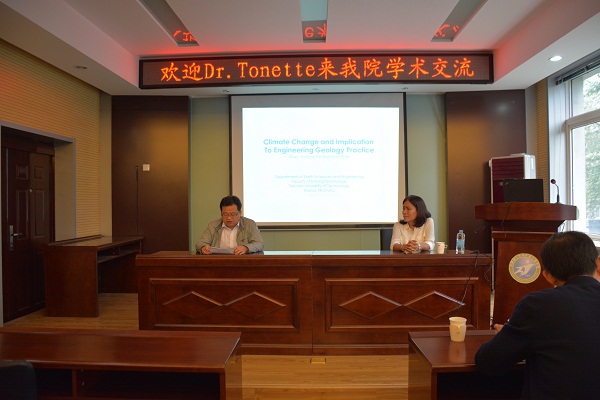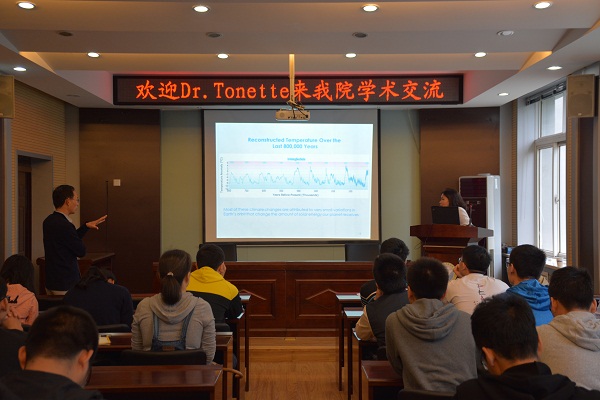 Antonette博士从地球能量平衡的角度对全球气候变化进行了阐释,详释了80万年以来全球气候变化的规律与特征,并深入探讨了全球气候变化为工程地质科研工作者带来的机遇与挑战。与会教师和学生同Antonette博士进行热烈互动交流,现场气氛活跃。