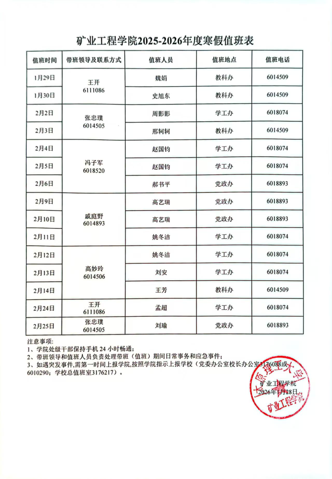 304永利集团2025-2026年度寒假值班安排表