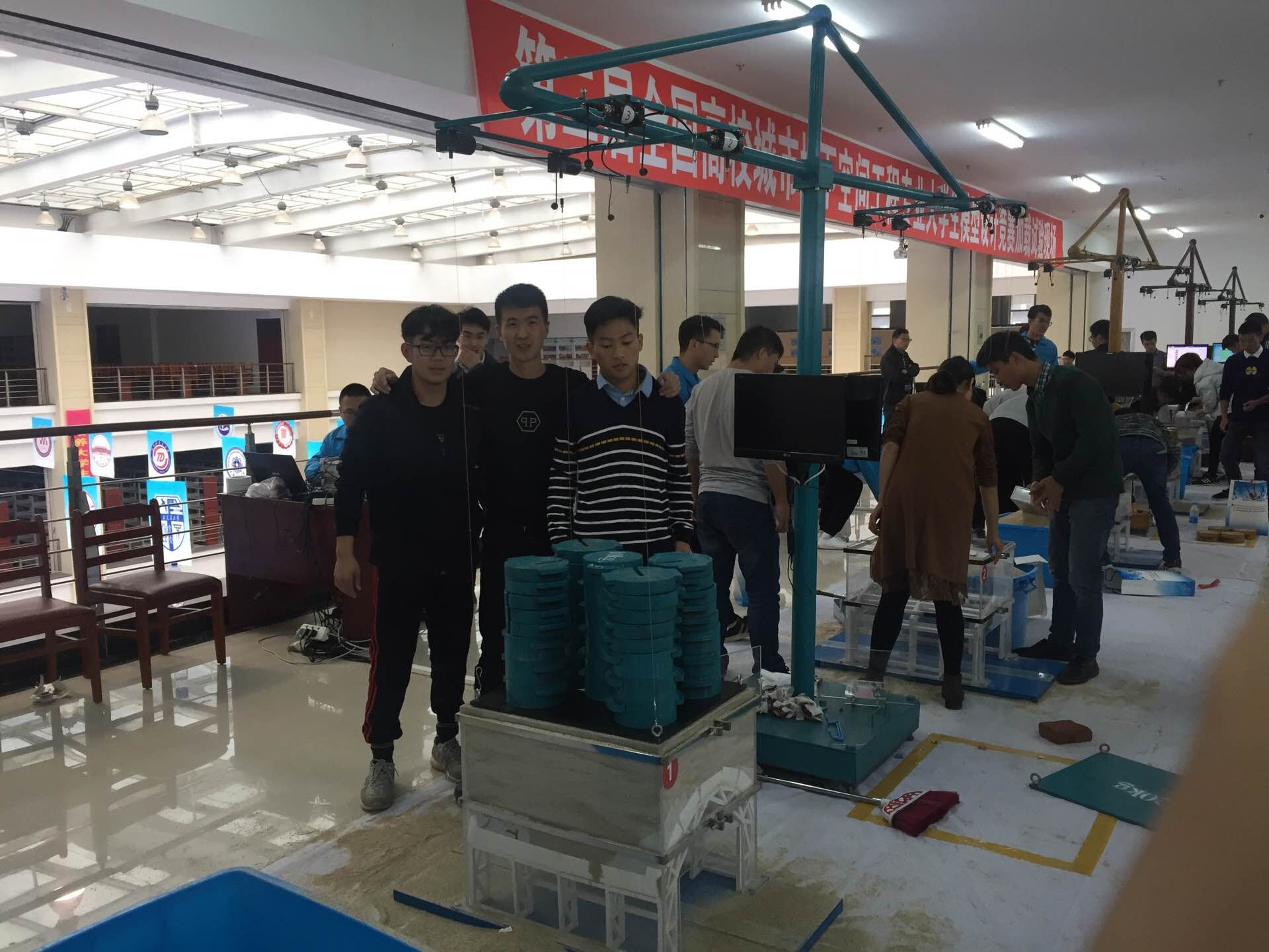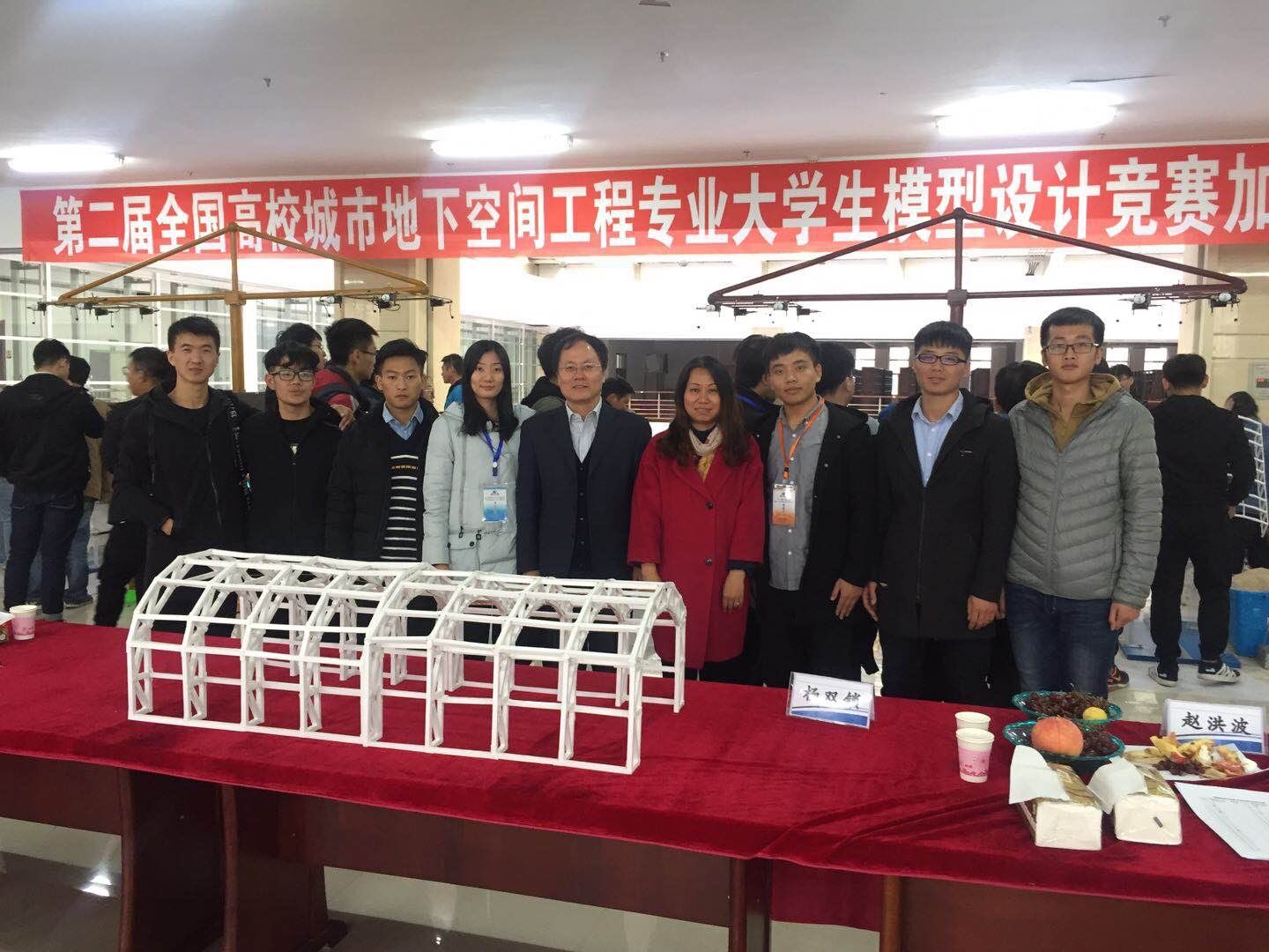 本次研讨会和大学生模型设计大赛,我院派出了由地下工程系杨双锁教授带队的9人代表团参加。参会期间,杨双锁教授连任了全国城市地下空间工程专业指导委员会委员,并应邀担任第二届全国高校城市地下空间工程专业大学生模型设计竞赛的评委。本次模型设计竞赛的主题为“格栅拱架的设计与建造”,整个竞赛分为格栅拱架模型现场制作、模型顶部白卡纸封层制作、结构检验、模型安装、现场加载检测等多个比赛环节。通过10月14日一天近10小时紧张的模型现场制作环节,由王梅老师和郝瑞卿老师指导的两组队伍均顺利进入第二天的现场加载测试环节。在模型结构合理、制作精良的基础上,我院参赛学生在第二天比赛现场稳扎稳打,最终获得加载297kg和满载302kg的好成绩。其中,地下工程系本科生郝晨良、石晓巅、宋晓康组成的参赛队获得第二届全国城市地下空间工程专业大学生设计大赛三等奖,淦志强、杨朋博、辛国旭组成的参赛队获得第二届全国城市地下空间工程专业大学生设计大赛二等奖。在此次比赛过程中,充分展现了我院学生扎实的理论知识、活跃的创新思维、较强的实践能力和我院高水平的教学实力。另外,中国岩石力学与工程学会在本次大会上还评选了“2017届城市地下空间工程优秀毕业生”,我校2013级学生高梦颖、张煌、张煜同学获此殊荣,并且这三名同学被分别保送至东南大学和河海大学。