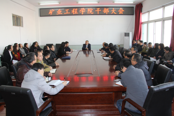 2019年1月21日下午,矿业工程学院干部大会在虎峪校区致明楼318会议室召开,校党委常委树学峰副校长、组织部贾朝红部长出席会议,学院党政班子成员、各系、中心主任、副主任、教工党支部书记以及学院三办一委全体工作人员参加了会议。会议由学院党委书记薛武杰主持。