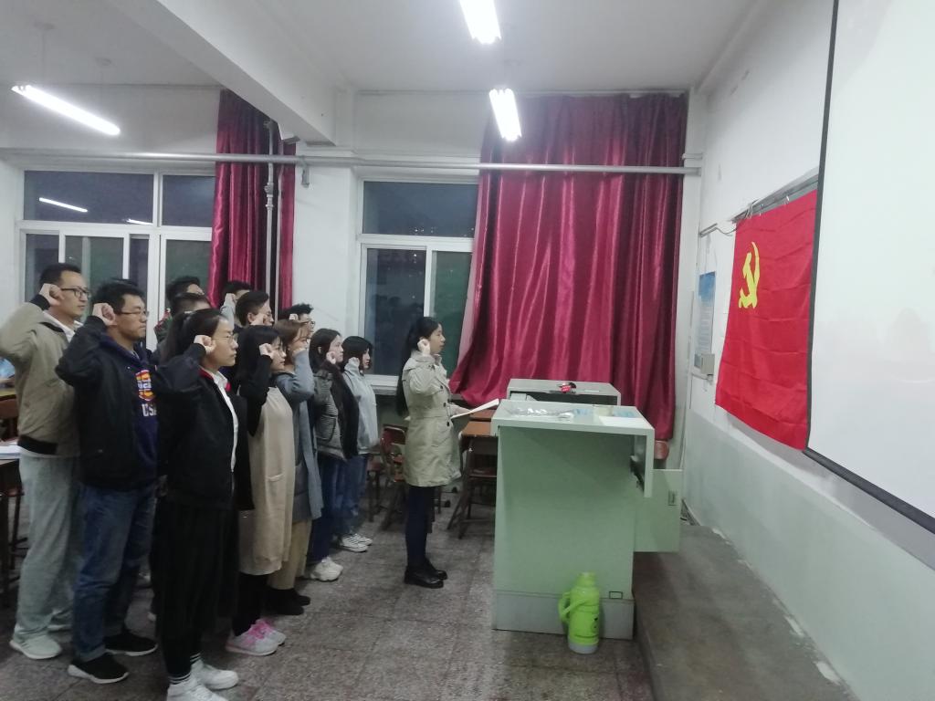 所有参会人员奏唱国际歌。孙文达等13位名发展对象依次上台讲述了自己的入党动机和对党的理解、认识,同时结合自己的实际情况表达了自己加入中国共产党的决心和强烈愿望,入党介绍人分别发表了对发展对象的意见。投票表决阶段,13名发展对象均为全票通过,支部书记对大家加入中国共产党表示祝贺,并带领13名同志面向党旗进行了庄严的入党宣誓。