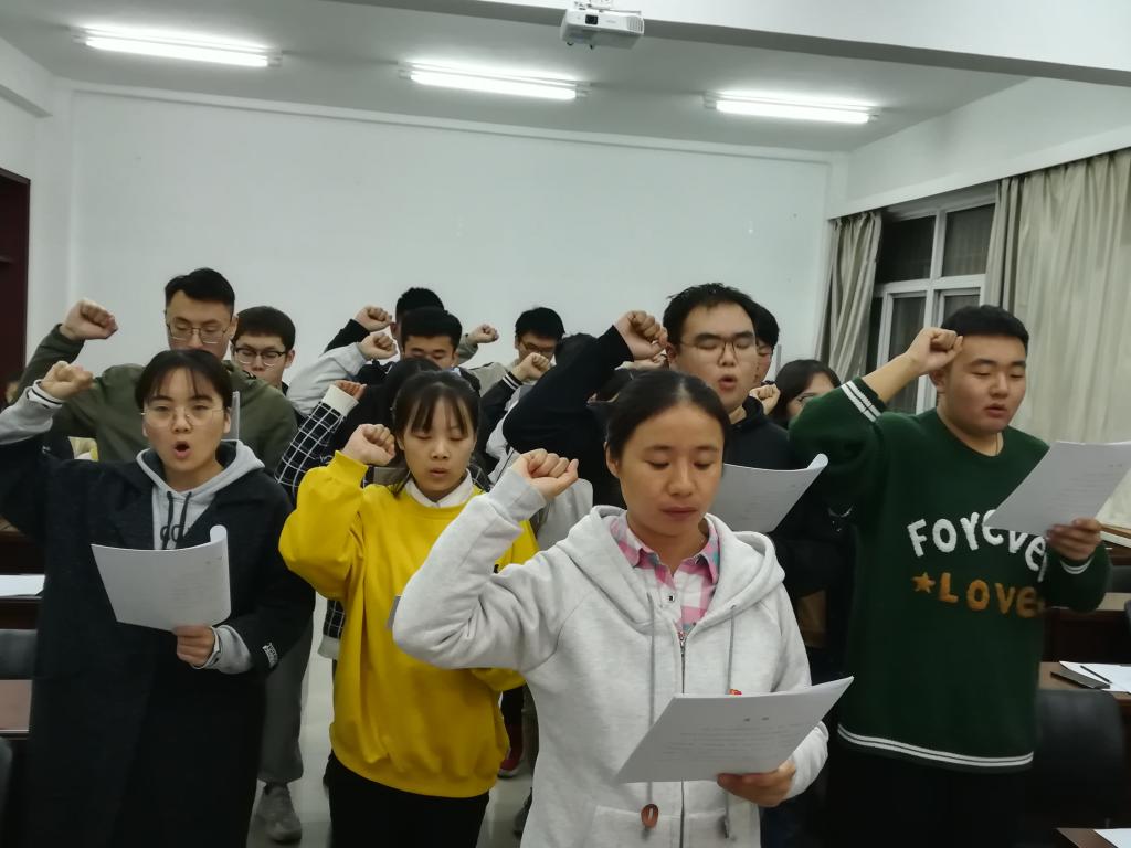 所有参会人员奏唱国际歌。祁妍敏等18位名发展对象依次上台讲述了自己的入党动机和对党的理解、认识,同时结合自己的实际情况表达了自己加入中国共产党的决心和强烈愿望,入党介绍人分别发表了对发展对象的意见。投票表决阶段,18名发展对象均为全票通过,支部书记对大家加入中国共产党表示祝贺,并带领18名同志面向党旗进行了庄严的入党宣誓。
