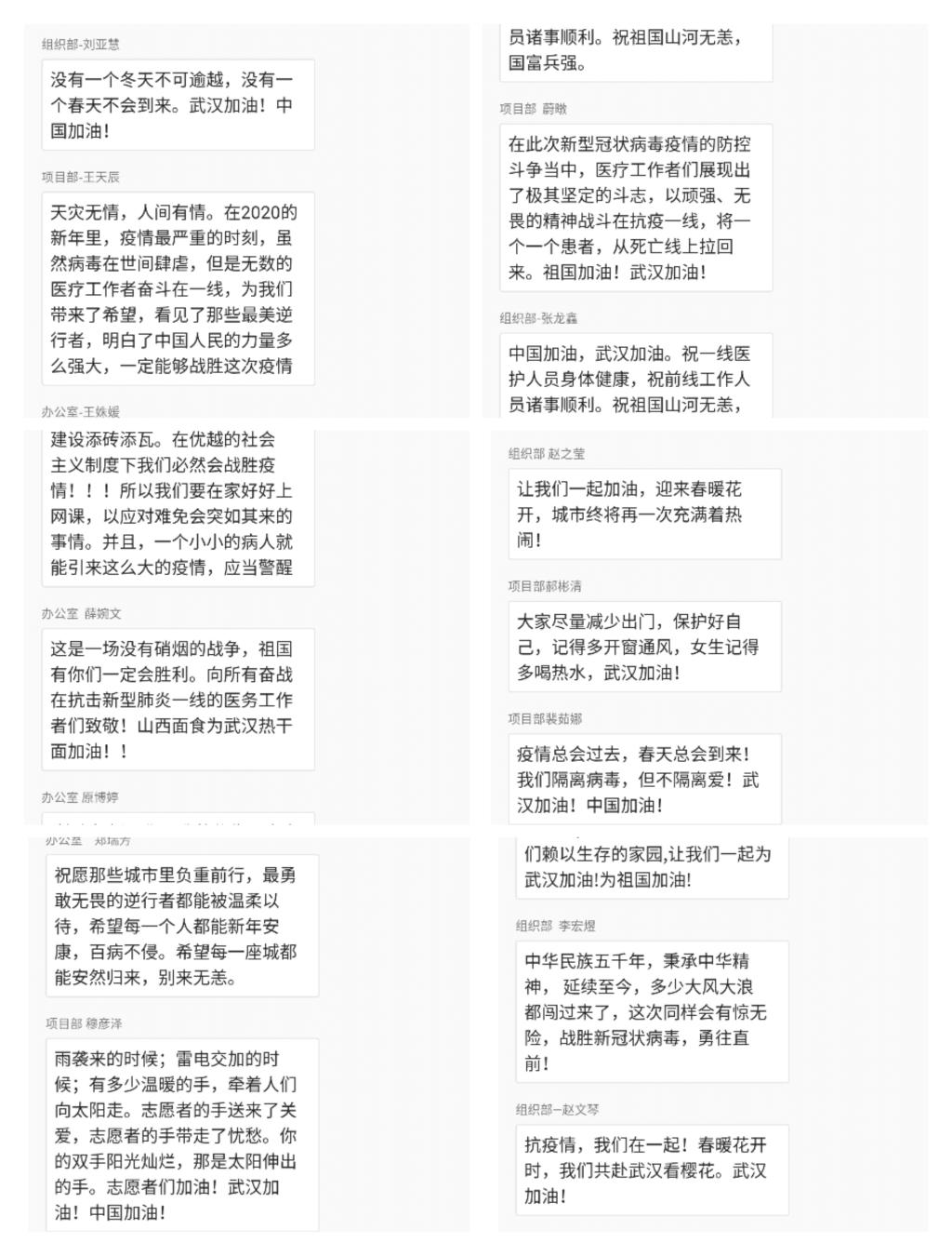 成员们就最近挺身而出奋斗在一线的“最美逆行者”们抒发了敬仰之情,这些人让我们每一个人都深切体会到无处不在的“雷锋精神”,大家表示只有积累知识,励精图治,才能在实际行动中发挥新时代青年的作用,其中一些成员敢为人先,加入一线,成为抗击疫情的志愿者,彰显雷锋精神,为抗疫贡献了自己的力量。