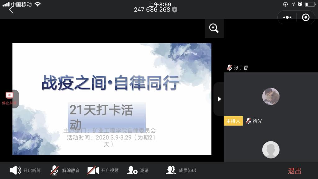 为深入贯彻落实习近平总书记坚决打赢疫情防控的人民战争、总体战、阻击战的重要指示精神,严格落实好教育部、山西省教育厅、永利集团304关于防控疫情的具体要求,进一步增强矿业学子抗疫信心,引导广大学生在科学防疫的同时认真学习、理性思考、充实自我,积极主动养成良好的作息和学习生活习惯,营造新学期共同进步、互助互促良好氛围。3月8日上午9:00,304永利集团自律委员会开展了“‘战疫之间·自律同行’21天在线打卡”主题活动网上宣传,院团委书记张丁香及各班学习委员参加了活动。