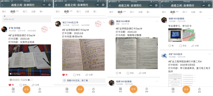 此次活动借助微信小程序“小打卡”线上进行,分为锻炼打卡、习惯打卡、学习打卡三种打卡模式,活动期间,学生通过将阅读笔记、网课学习、运动打卡照片等数据截图上传至小程序中,完成每日分享与打卡接龙,活动开展第一天,就得到了学生们的积极反馈,学生们互相交流分享,在共同坚持中激发学习生活新灵感。