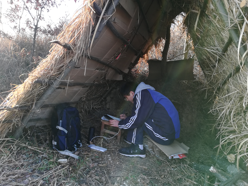 “天气好的时候,还挺好的,下雨天,真的非常冷,风也很大,走到草棚里鞋子都湿透了,就比较冷了”邹正伟说。这三个星期,邹正伟按时参加了学校的网课运行和在线班会,虽有卡顿,但是总体影响不大。下午也有课的时候,中午就不回家,从早上八点到下午五点都在草棚教室中度过,趁着中午空余的时间,写一写作业、记一记笔记,再捡点干柴,一个馒头,一杯水,就是一顿午餐,一般下午上完课,回了家天都黑了。