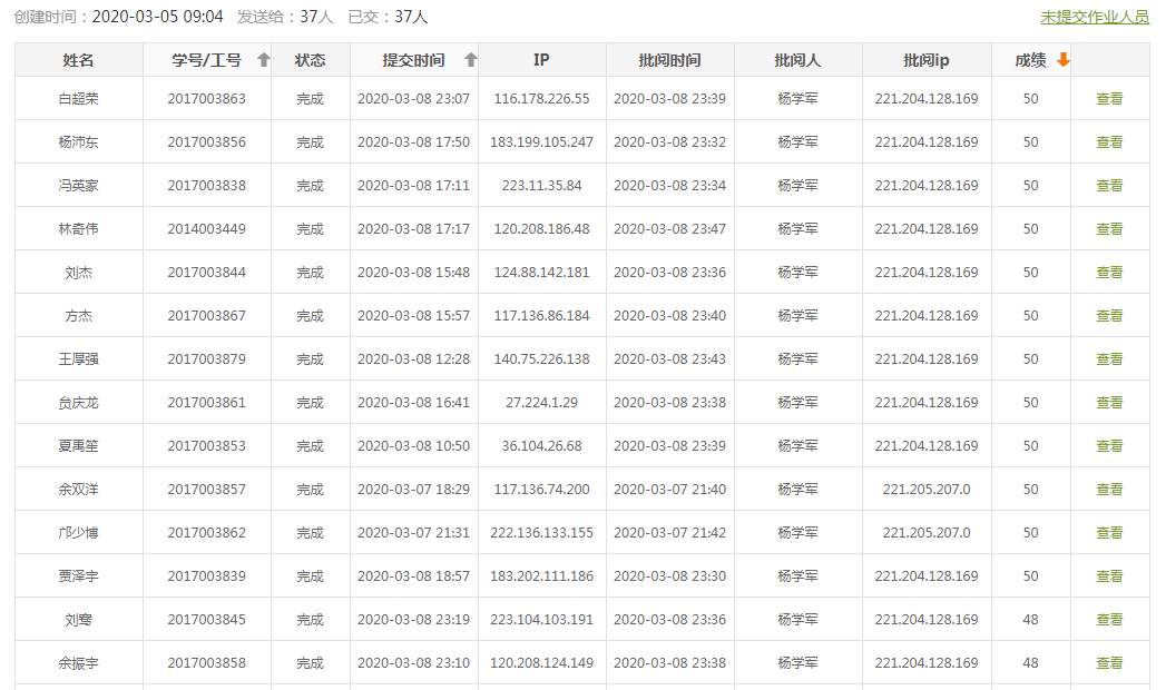 在网上布置作业和提交作业是一个很不错的形式,教师评判完作业后,系统能自动加分和排序,省却了教师平时收发作业、保存作业和加分排序这些简单费时的工作,同时学生可快速根据老师公布的答案纠正自己的不足。图 8是其中一次的作业完成和评分情况。
