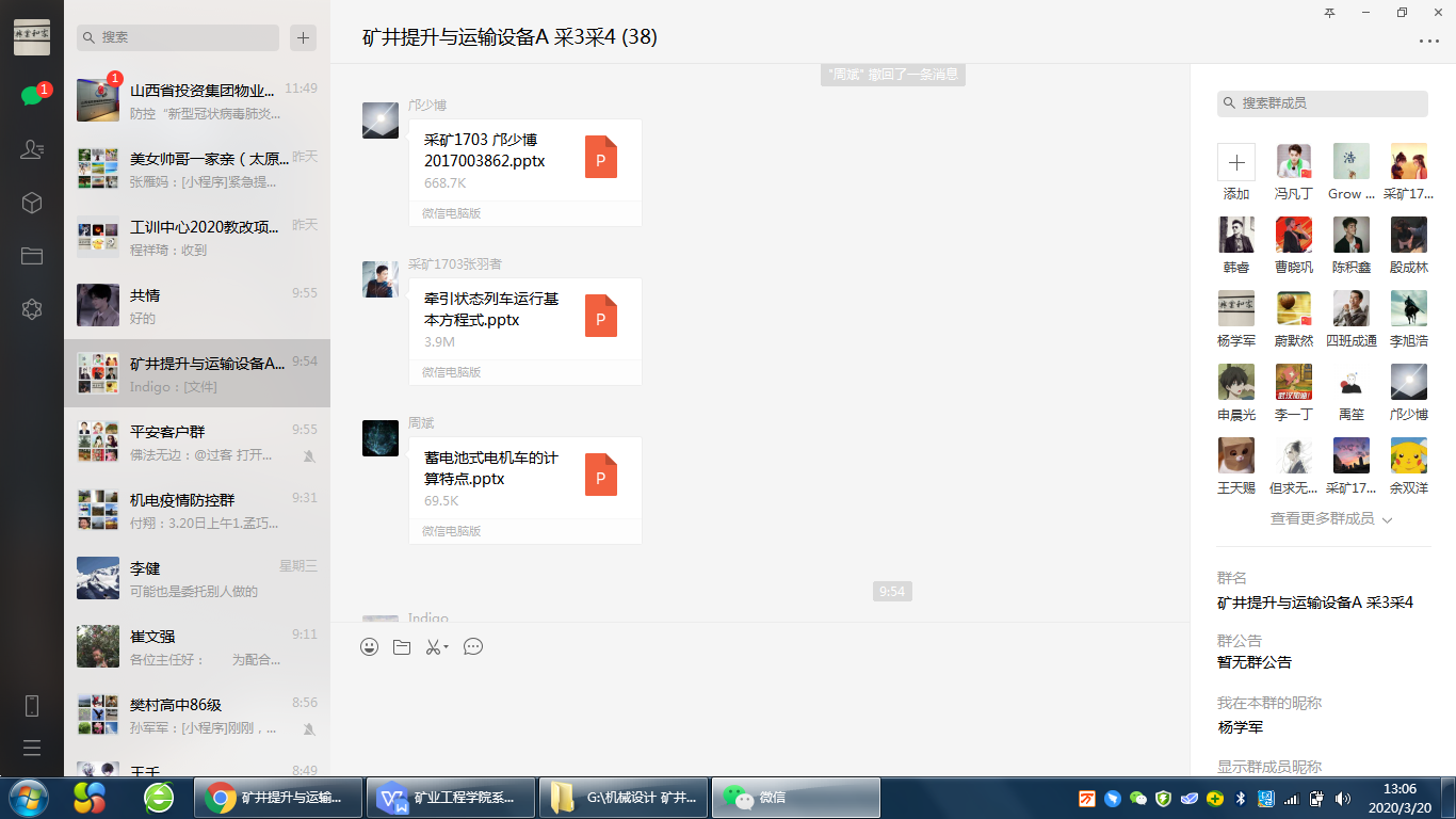 《矿井提升与运输设备A》为采专业必修的一门专业基础课,其中理论教学任务为12周,36学时,本学期由孟巧荣、王爱玉和我共同承担7个班的教学任务。在当前特殊情况下,我们按照学校“停课-不停学-不停教”的工作部署,已经按照原定教学内容和教学计划开展了网络教学。目前,课程网络教学运行正常、教学效果良好。现主要采用的上课的方式是:课前录制教学视频,超星学习共享资料,课堂引导学生观看,腾讯会议互动答疑,微信群里交流通知,网络手段综合管理。现就过去5周的教学体会同大家分享,不足之处,请老师和同学们多提宝贵意见和建议。