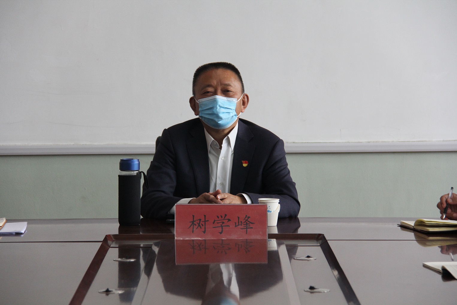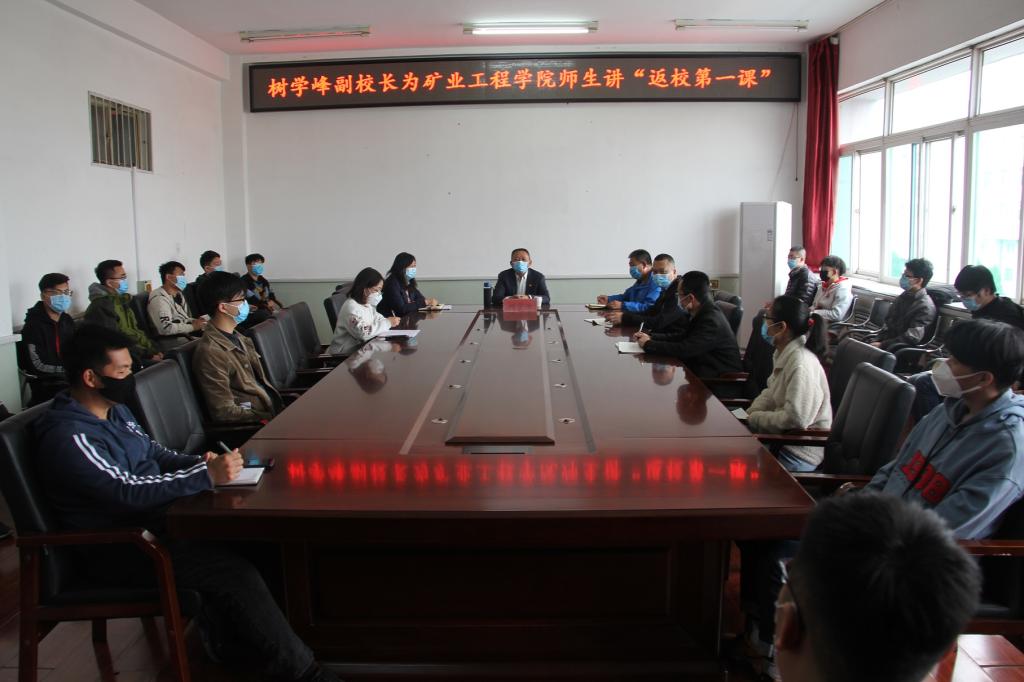 4月14日下午,副校长树学峰教授在虎峪校区致明楼318会议室为矿院师生现场讲授“返校第一课”。院党委书记薛武杰,院长董宪姝,副书记巴大志,学工办主任刘宏伟,辅导员刘安老师一同走进课堂。