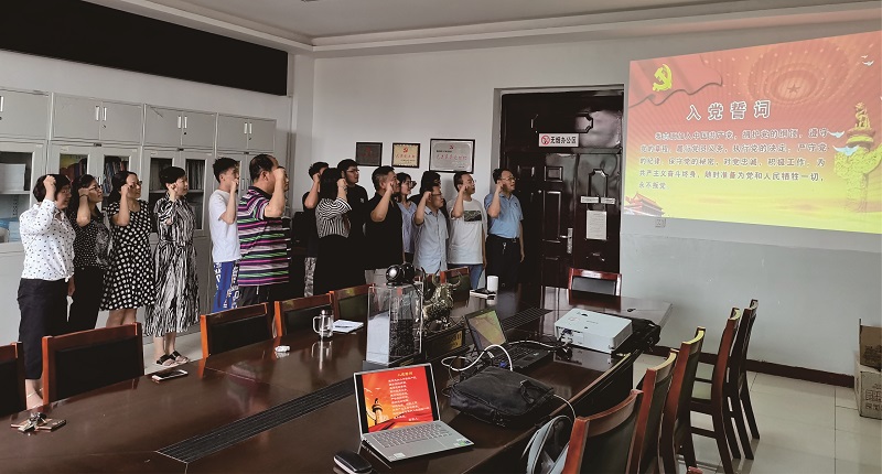 观看直播结束后,地科系所有党员开展“重温入党誓词、重忆入党初心”活动,全体党员面向党旗,高举右拳重温入党誓词,神情庄重、声音铿锵。