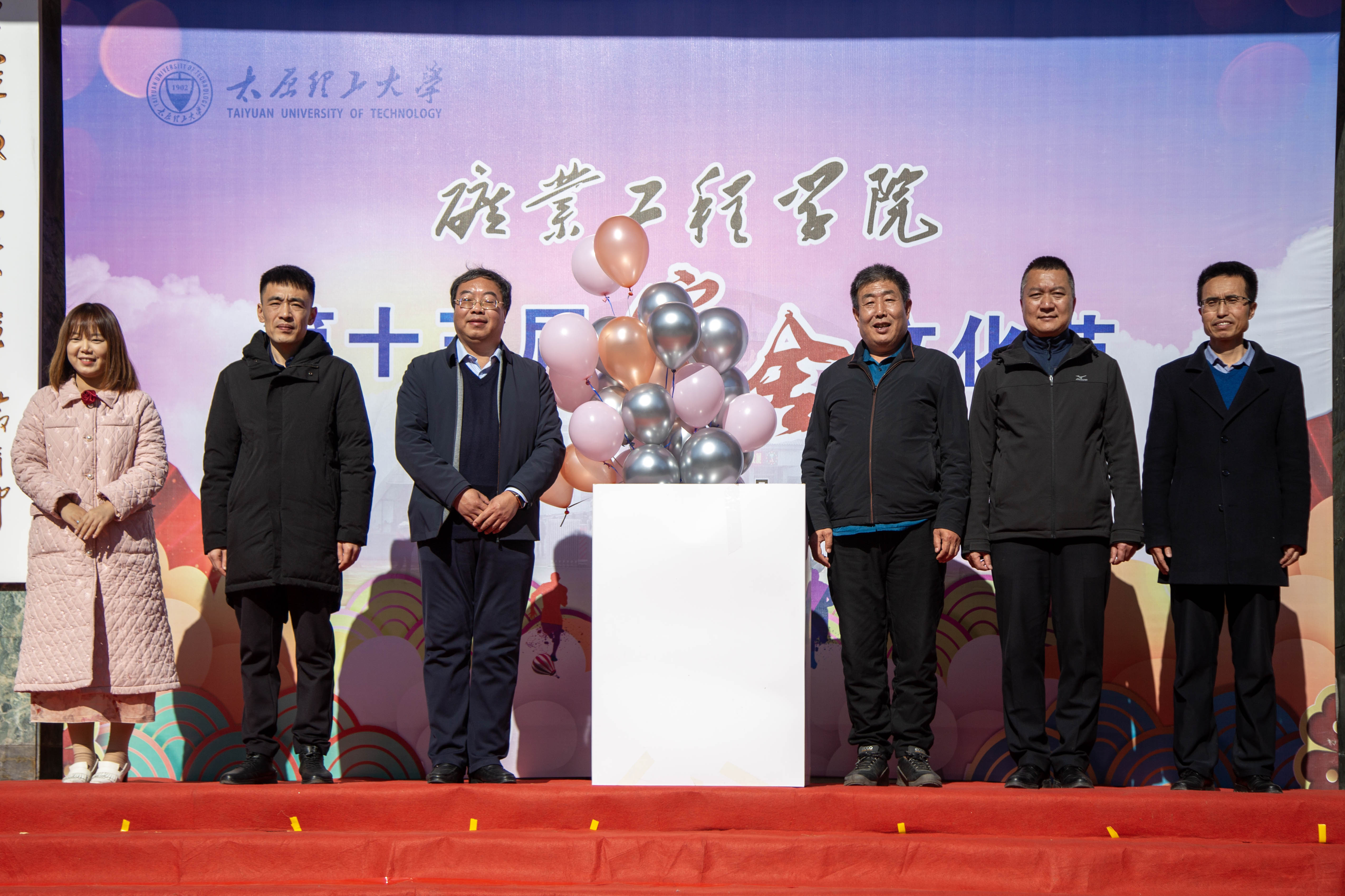 各位领导和嘉宾于礼盒前拉动红布放飞气球,304永利集团第十三届“宿舍文化节”正式启动。