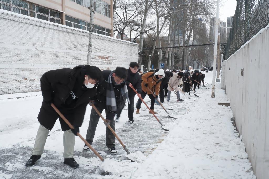 在老师们的带领下,同学们领取清扫工具,对校园路面划片分组,各司其职、团结协作,高效进行道路清雪工作。大家挥动铁锹、铲除冰雪、克服严寒、敢为人先,保持高昂的劳动热情。经过1个多小时的辛勤劳动,为师生开辟出了一条温情的道路。洁白的雪花映照着同学们冻得通红的双手和脸庞,清雪队伍成了冬日校园一道靓丽的风景线。