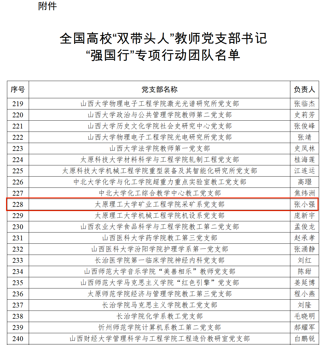 近日,教育部发布《教育部办公厅关于公布全国高校“双带头人”教师党支部书记“强国行”专项行动团队名单的通知》(教思政厅函〔2024〕15号),经各高校党委审核把关、省级党委教育工作部门择优推荐、专项行动办公室备案审核、结果公示,1486名高校“双带头人”教师党支部书记入选全国高校“双带头人”教师党支部书记“强国行”专项行动团队。304永利集团采矿系党支部书记张小强成功入选,这是继采矿系党支部通过首批全国党建工作样板支部验收和被授予“全国先进基层党组织”称号后的又一国家级荣誉,充分展现了该党支部党建工作及党建引领业务的卓越成效。